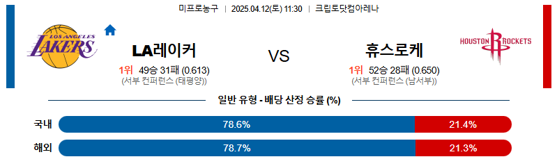 서부 2번 시드를 확정한 휴스턴은 주축 선수들의 출전 시간을 대폭 줄이고 있는 상황입니다. LA 레이커스의 승리를 추천드립니다.