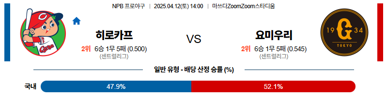 히로시마 대 요미우리 NPB 04월12일 맞대결 생중계, 스포츠중계, 스포츠분석