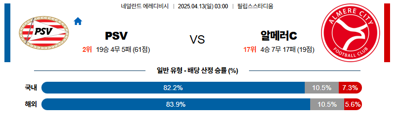 PSV아인트호벤 대 알메러시티 에레디비지에 04월13일 맞대결 생중계, 스포츠중계, 스포츠분석