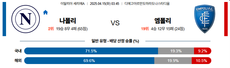 나폴리 대 엠폴리 세리에A 04월15일 맞대결 생중계, 스포츠중계, 스포츠분석