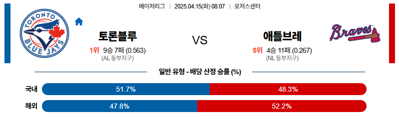 토론토 대 애틀랜타 MLB 04월15일 맞대결 생중계, 스포츠중계, 스포츠분석