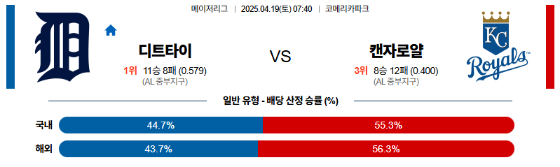 디트로이트 대 캔자스시티 MLB 04월19일 맞대결 생중계, 스포츠중계, 스포츠분석
