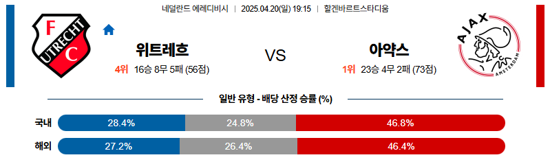 위트레흐트 대 아약스 에레디비지에 04월20일 맞대결 생중계, 스포츠중계, 스포츠분석