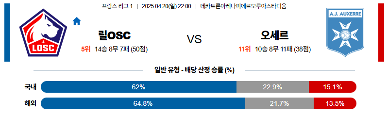 릴 대 오세르 리그앙 04월20일 맞대결 생중계, 스포츠중계, 스포츠분석
