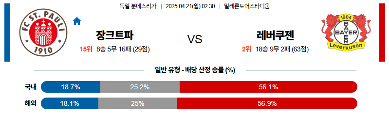 상파울리 대 레버쿠젠 분데스리가 04월21일 맞대결 생중계, 스포츠중계, 스포츠분석