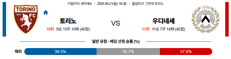 토리노 대 우디네세 세리에A 04월21일 맞대결 생중계, 스포츠중계, 스포츠분석