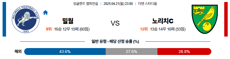 밀월 대 노리치 잉글랜드챔피언쉽 04월21일 맞대결 생중계, 스포츠중계, 스포츠분석