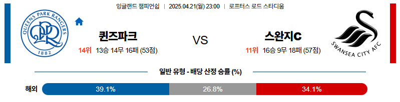 QPR 대 스완지 잉글랜드챔피언쉽 04월21일 맞대결 생중계, 스포츠중계, 스포츠분석