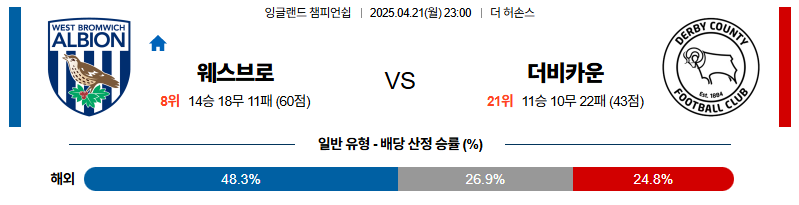 웨스트 대 더비카운티 잉글랜드챔피언쉽 04월21일 맞대결 생중계, 스포츠중계, 스포츠분석