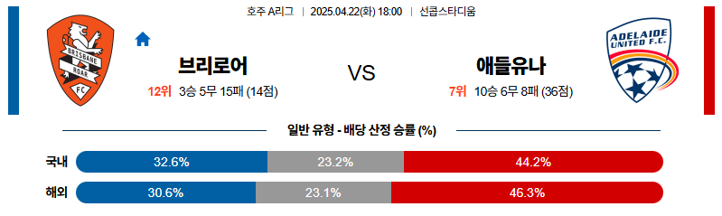 브리즈번 대 애들레이드유나이티드 호주A리그 04월22일 맞대결 생중계, 스포츠중계, 스포츠분석