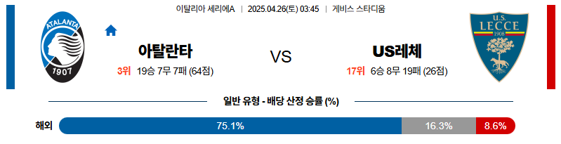 아탈란타 대 레체 세리에A 04월26일 맞대결 생중계, 스포츠중계, 스포츠분석