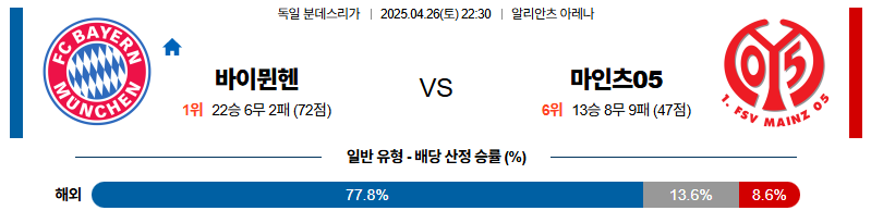 바이에른뮌헨 대 마인츠 분데스리가 04월26일 맞대결 생중계, 스포츠중계, 스포츠분석