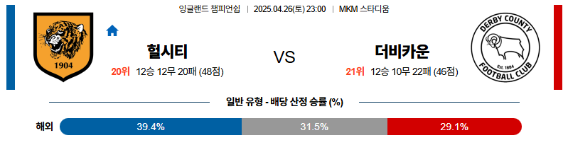 헐시티 대 더비카운티 잉글랜드챔피언쉽 04월26일 맞대결 생중계, 스포츠중계, 스포츠분석