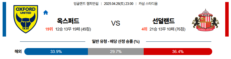 옥스퍼드 대 선덜랜드 잉글랜드챔피언쉽 04월26일 맞대결 생중계, 스포츠중계, 스포츠분석