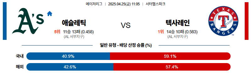 애슬레틱스 대 텍사스 MLB 04월25일 맞대결 생중계, 스포츠중계, 스포츠분석