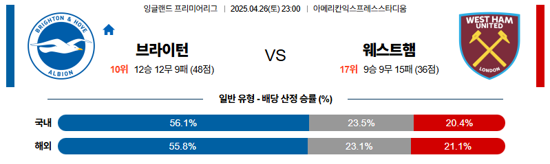 브라이턴 대 웨스트햄 프리미어리그 04월26일 맞대결 생중계, 스포츠중계, 스포츠분석