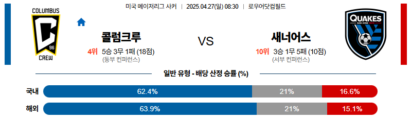 콜럼버스 대 산호세 메이저리그사커 04월27일 맞대결 생중계, 스포츠중계, 스포츠분석
