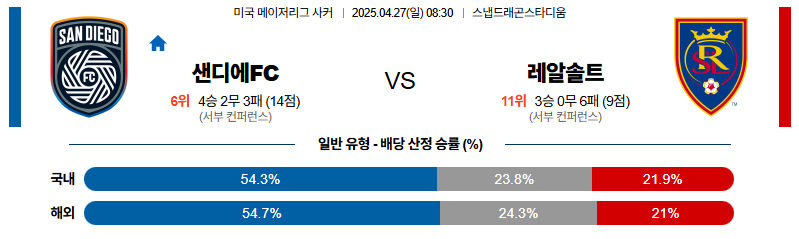 샌디에고 대 솔트레이크 메이저리그사커 04월27일 맞대결 생중계, 스포츠중계, 스포츠분석