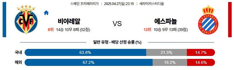 비야레알 대 에스파뇰 라리가 04월27일 맞대결 생중계, 스포츠중계, 스포츠분석