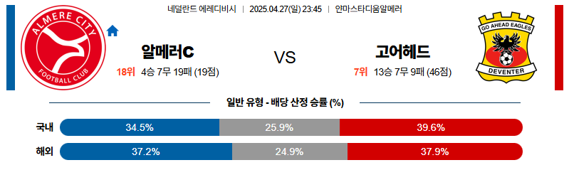 알미르시티 대 고어헤드이글스 에레디비지에 04월27일 맞대결 생중계, 스포츠중계, 스포츠분석