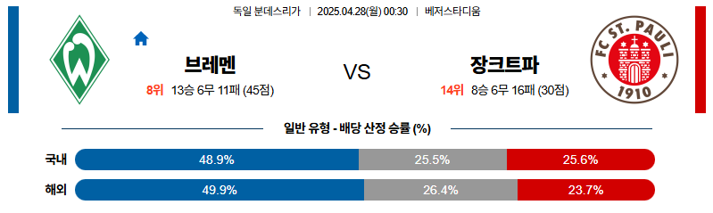 브레멘 대 상파울리 분데스리가 04월28일 맞대결 생중계, 스포츠중계, 스포츠분석