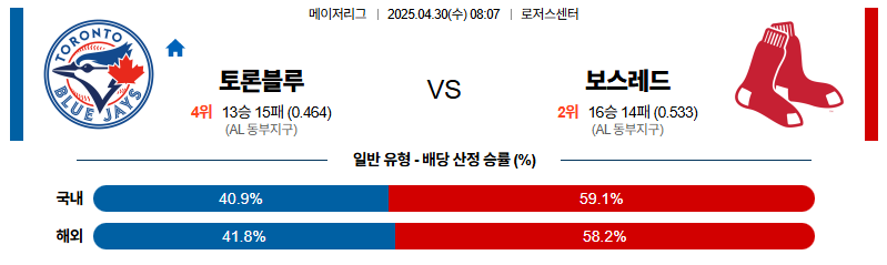토론토 대 보스턴 MLB 04월30일 맞대결 생중계, 스포츠중계, 스포츠분석