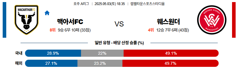 맥아서 대 웨스턴시드니 호주A리그 05월03일 맞대결 생중계, 스포츠중계, 스포츠분석