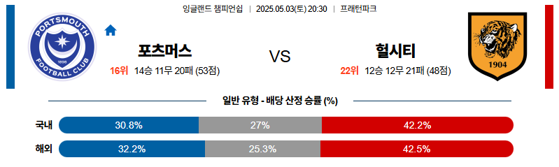 포츠머스 대 헐시티 잉글랜드챔피언쉽 05월03일 맞대결 생중계, 스포츠중계, 스포츠분석