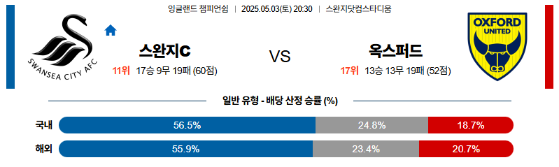 스완지시티 대 옥스퍼드 잉글랜드챔피언쉽 05월03일 맞대결 생중계, 스포츠중계, 스포츠분석