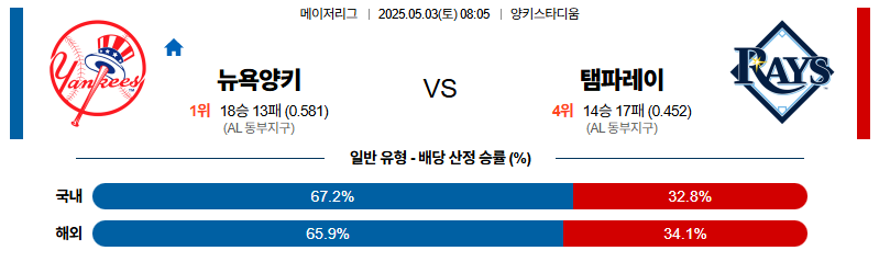 뉴욕양키스 대 탬파베이 MLB 05월03일 맞대결 생중계, 스포츠중계, 스포츠분석
