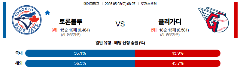 토론토 대 클리블랜드 MLB 05월03일 맞대결 생중계, 스포츠중계, 스포츠분석
