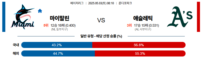 마이애미 대 애슬레틱스 MLB 05월03일 맞대결 생중계, 스포츠중계, 스포츠분석