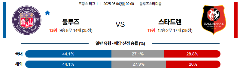 툴루즈 대 스타드렌 리그앙 05월04일 맞대결 생중계, 스포츠중계, 스포츠분석