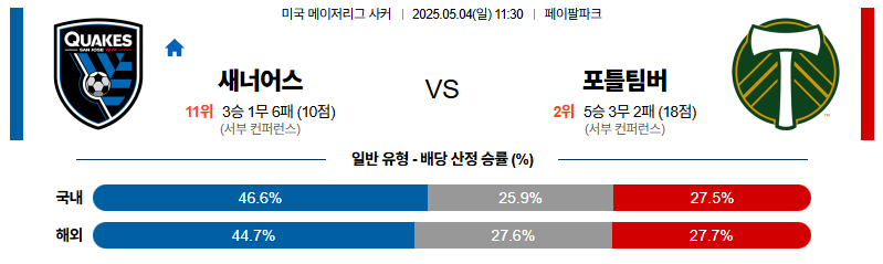 산호세 대 포틀랜드 메이저리그사커 05월04일 맞대결 생중계, 스포츠중계, 스포츠분석