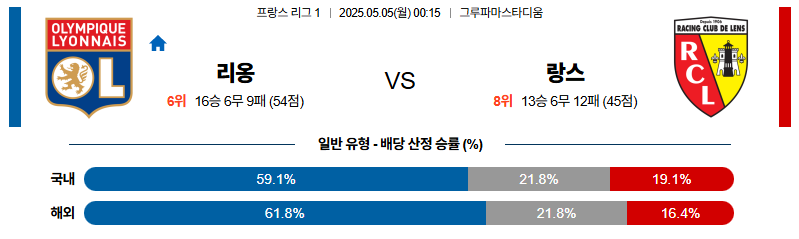 리옹 승, 핸디 승, 오버. 리옹은 홈에서 중원 응집도, 전환 속도, 전방 마무리까지 전술적 밸런스를 잘 유지하고 있으며, 징계와 부상 이탈을 최소화하고 있습니다. 랑스는 수비 커버 범위 약화와 전방 공백으로 인해 중원과 박스 앞에서 응집력을 잃고 있으며, 구조적으로 흔들릴 가능성이 높습니다.