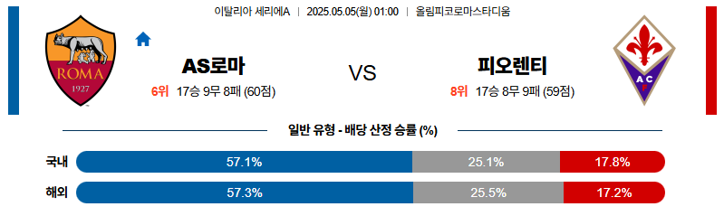 AS로마 대 피오렌티나 세리에A 05월05일 맞대결 생중계, 스포츠중계, 스포츠분석