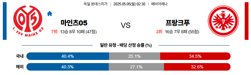 마인츠 대 프랑크푸르트 분데스리가 05월05일 맞대결 생중계, 스포츠중계, 스포츠분석