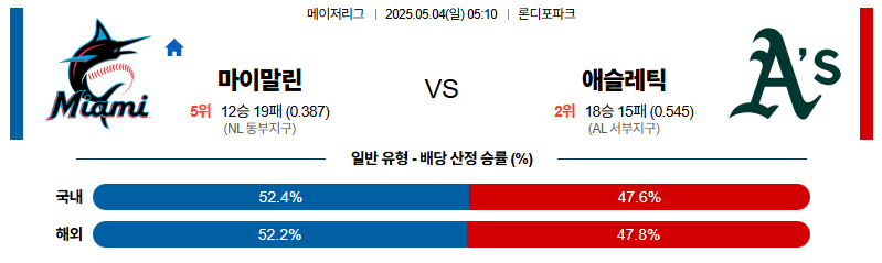 마이애미 대 애슬레틱스 MLB 05월04일 맞대결 생중계, 스포츠중계, 스포츠분석