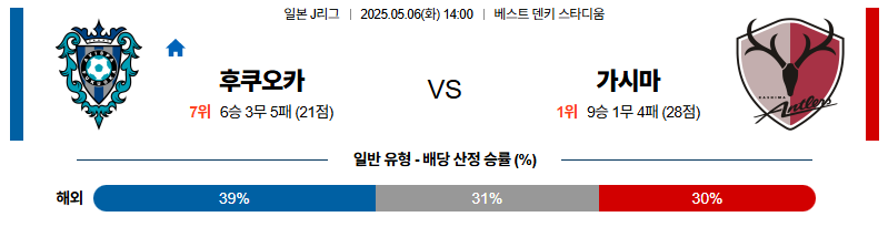 후쿠오카는 전술적 구조에서 측면 수적 열세와 커버 미스가 반복되며 실점 리스크가 크고, 가시마는 빠른 전개와 템포 조절 능력을 바탕으로 안정적인 승부 흐름을 만들어낼 수 있습니다. 전체 경기 흐름을 고려할 때 후쿠오카의 패배 가능성이 높습니다.