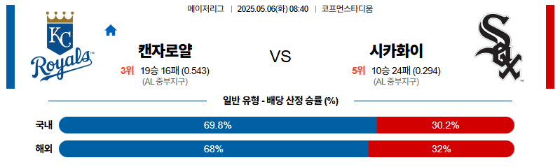 캔자스시티 대 시카고W MLB 05월06일 맞대결 생중계, 스포츠중계, 스포츠분석