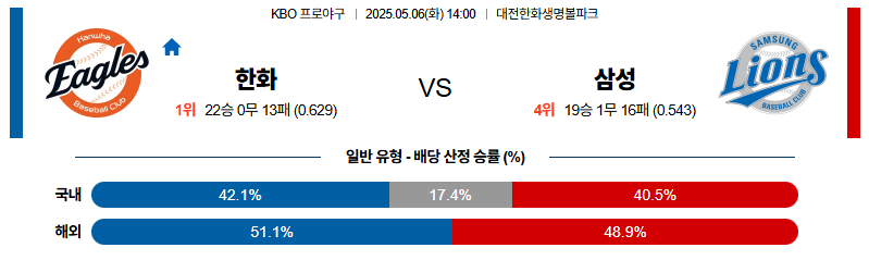 한화 대 삼성 KBO 05월06일 맞대결 생중계, 스포츠중계, 스포츠분석