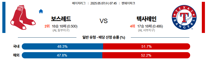 보스턴 대 텍사스 MLB 05월07일 맞대결 생중계, 스포츠중계, 스포츠분석