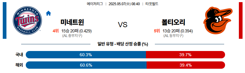 미네소타 대 볼티모어 MLB 05월07일 맞대결 생중계, 스포츠중계, 스포츠분석
