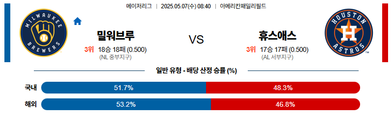 밀워키 대 휴스턴 MLB 05월07일 맞대결 생중계, 스포츠중계, 스포츠분석