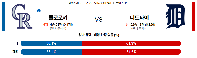 콜로라도 대 디트로이트 MLB 05월07일 맞대결 생중계, 스포츠중계, 스포츠분석