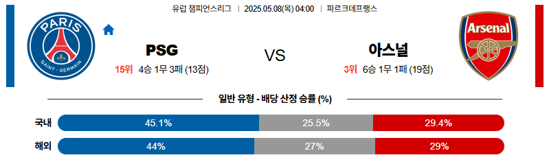 아스날은 주력 선수들의 이탈로 인해 수비와 중원의 연결 고리가 끊긴 상태입니다. 반면 파리는 홈에서의 흐름과 전개 능력, 수비 간격까지 모두 정돈된 팀입니다. 이 경기는 양 팀 간의 전술 완성도와 전력 유지력 차이가 극명하게 드러날 수밖에 없습니다. 흐름상 파리생제르망의 승리가 가장 설득력 있는 선택입니다.
