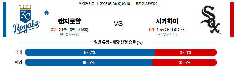 캔자스시티 대 시카고W MLB 05월08일 맞대결 생중계, 스포츠중계, 스포츠분석
