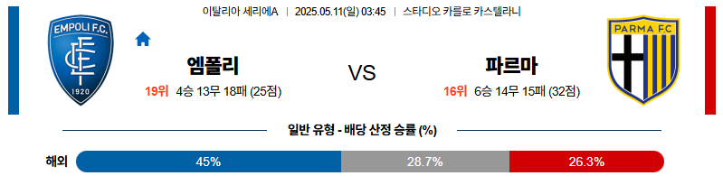 엠폴리 대 파르마 세리에A 05월11일 맞대결 생중계, 스포츠중계, 스포츠분석