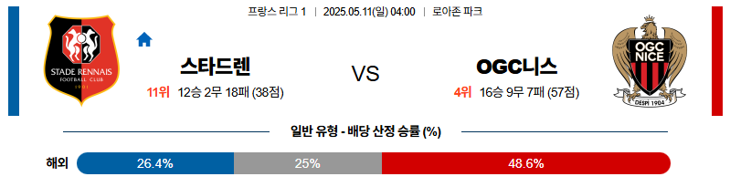 스타드렌 대 OGC니스 리그앙 05월11일 맞대결 생중계, 스포츠중계, 스포츠분석