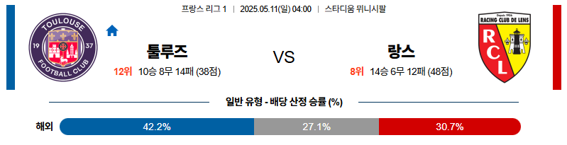 양 팀 모두 수비진 결장 이슈가 겹친 상황이지만, 툴루즈는 홈 경기에서 빠른 역습과 전방 움직임에서 랑스보다 유리한 조건을 갖추고 있습니다. 특히 돈눔과 킹의 역습 전개는 랑스의 느린 수비 전환과 측면 공간 노출을 공략하기에 적합합니다. 반면 랑스는 전방 공격의 단조로움과 후방 조직력 불안으로 인해 역습 대응에 어려움을 겪고 있으며, 실점 리스크가 높습니다. 두 팀 모두 득점력은 제한적이기에 저득점 양상에서 툴루즈가 근소하게 앞설 가능성이 큽니다.